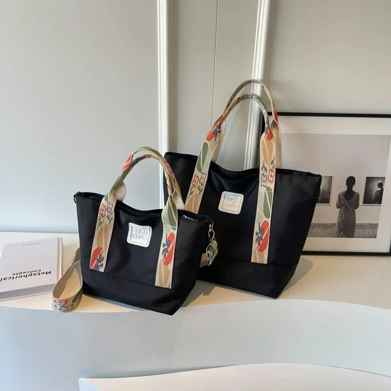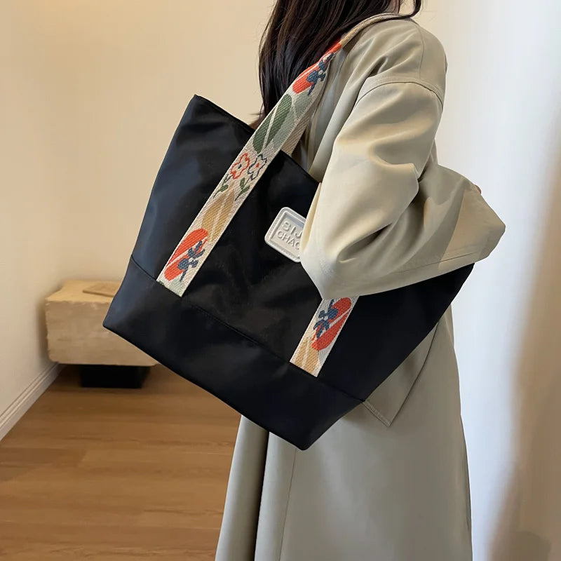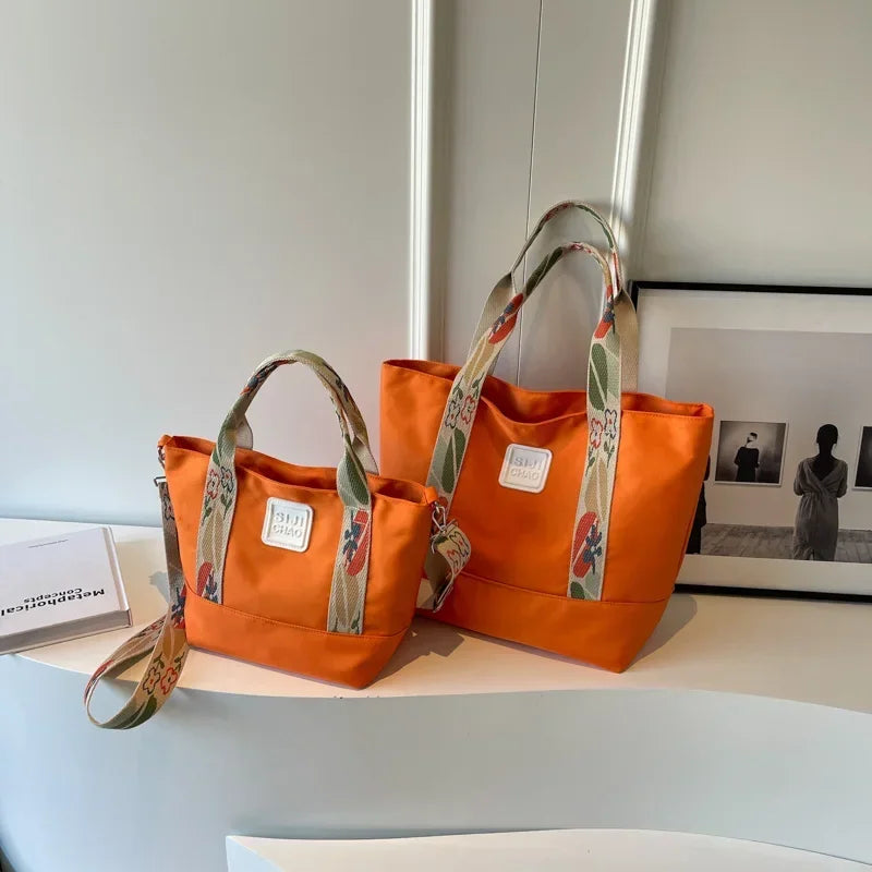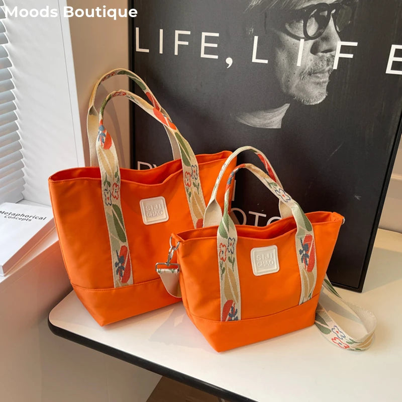 This versatile women's shoulder bag features a casual tote shape with a solid pattern, available in orange, beige, and black. Made from durable nylon with a polyester lining, it includes appliqué and floral decorations, along with open and interior pockets (slot, cell phone, zipper). The bag comes in two sizes: large (42x31x15cm) and small (33x23x15cm), and has two handles for comfortable carrying. Perfect for everyday casual occasions, it combines practicality with stylish details.